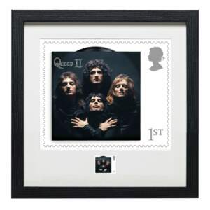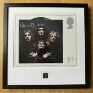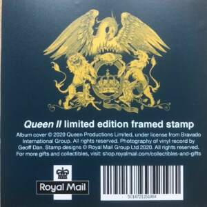 Contains an enlarged print of the Queen II stamp as well one of the actual stamps individually mounted.