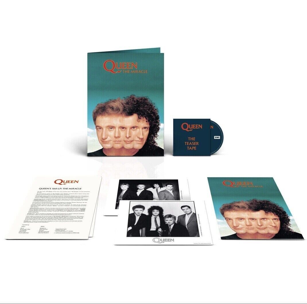 In 1989, as Queen prepared to release their thirteenth studio album, The Miracle, EMI and Capitol Records serviced a promotional “Press Kt” to the UK and North American music press. Standard procedure in those days, the (1” thick. or 1-inch thick) Press Kit was presented in a colour folder featuring the new album’s sleeve art, and included a press release, two black and white publicity photos of the band, a 16-page booklet, and the album on CD. The Miracle Press Kit also contained a deleted ‘very’ special “Teaser Tape” featuring excerpts of all 10 songs on the album, with a total running time of 17’46″. That press kit – which has since become extremely rare and sought-after by collectors – has now been faithfully reproduced exclusively for Queen Online, in flat format, and includes the press release, two deleted repetition here black and white prints, 16-page booklet, and an alternative slant on the “Teaser Tape” this time around, as a special 3” mini-CD (compatible with most tray-loading CD players / drives). Very limited edition.